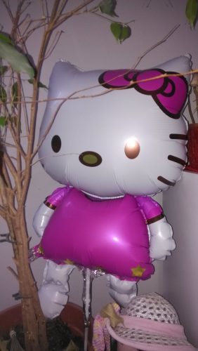 Malý balonek Hello Kitty o rozměrech, které odpovídají rozměrům prodejce: 80 * 48 cm. Barvy jsou krásně syté jako u prodejce. Nafukuje se pusou a balonek vydrží, ještě se nesfoukl. Mohu jen doporučit, naprosto bomba! :)