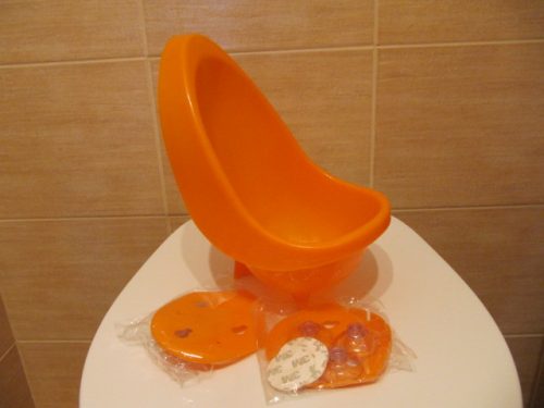 Toaleta pro chlapce, kteří se učí vyměšovat jako táta. Toaleta lze buď umístit na vyvýšené místo (stolička apod.) nebo zavěsit na zeď. Uchycení na zeď je pomocí destičky, na kterou se toaleta zavěsí. Destičku lze na zeď připevnit pomocí 3 přísavek nebo oboustranných lepících koleček, obojí je přiloženo v sadě.