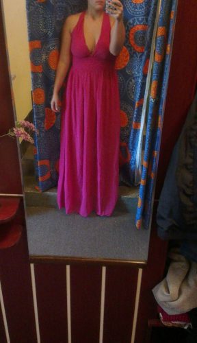 S šaty jsem spokojená. Vypadají kvalitně, podšívka je až na zem. Jsem z nich nadšená. Ale objednala jsem si větší velikost, protože jsem se bála, že je budu mít malé. Ale tabulka velikosti sedí a objednala bych si příště menší. Takže si je budu nechat trošku zmenšovat přes prsa a pod prsy. A taky si je musím nechat zkrátit, protože jak vidíte, stojím na prvním schodu a i tak jsou až po zem :), takže doporučuji i pro vysoké slečny :). Hodnocení: 10/10