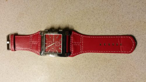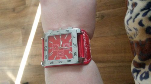 Pekné hodinky WoMaGe so širokým preštepovaným remienkom červenej farby/23,7 cm/ zo syntetickej kože.Štepovanie pekné,je biele,vôbec sa nepára,kvalita.Ciferník je strieborný.Predajcu odporúčam,expresné dodanie 15 dní.Boli objednané 15.1. a prišli 30.1.2015.