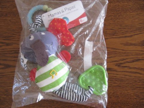 Plyšovo-látková hračka pro miminka. Při zmáčknutí bříška hraje asi 15 sekund jemnou melodii. Uši jsou šustící. Pod sloníkem je zavěšeno kousátko, druhé kousátko s gumovými výstupky je závěsný kroužek. Hezká hračka pro mimi v neutrálních barvách pro holčičku i kluka.