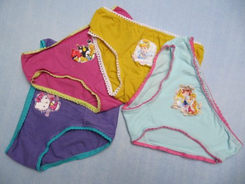 Bavlněné kalhotky vyššího střihu pro holčičky. Potisk je pogumovaný, po cca 2-3 praních popraskal a olupuje se. Ušity rovně. Objednána vel. 4 roky, na cedulce uvedena vel. 7/8, ale odpovídá 4-6 let. Šířka přes boky 2x 24 cm, pas v klidu 2x 23 cm, roztáhnutý max. 2x 35 cm, výška 18,5 cm. V balení 12 ks, různé barvy i motivy - Princezny, Angry Birds, Hello Kitty