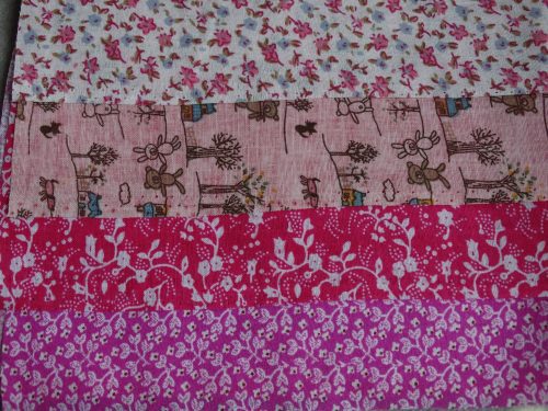 Balíček 9 sladěných druhů látek, rozměr 50x50cm, čtverce ustřiženy rovně, barvy a motivy odpovídají fotkám výrobce, látka je příjemná, trochu pruží, ale nebude to 100% bavlna - látka není tak silná, ale např. na polštářek pro děti nebo kapsář k posteli je to super