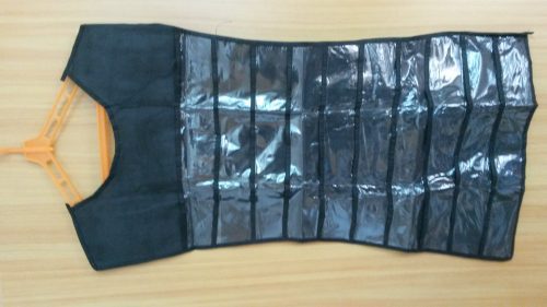 Je to obojstranný obal na šperky.Na prednej strane je 30 vrecúšok na drobné šperky -náušnice,náramky... a na zadnej stane je 14 všitých háčikov na náhrdelníky.Rozmer 80 × 42 cm.Predné vrecká sú PVC a ostatné netkaná textília,vypadá to byť pevné.