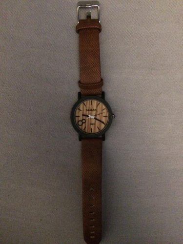 Hnědé hodinky s motivem dřeva a s černým kroužkem kolem ciferníku. Barva zcela odpovídá a také fungují bez toho, aby se opožďovaly.