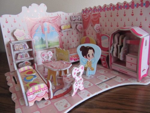 Roztomilý pokojíček na hraní, lze k němu přidávat i další pokojíky. Pokojíček je vyražený na 4 deskách, z kterých se jednotlivé díly musí vylámat. Většina dílů jde velmi snadno vyndat, některé menší kousky je lepší nechat vylomit od dospělého. Jedná se o 2 mm bílou pěnovku, potaženou z obou stran slabým kartonem. Všechny díly jsou z jedné strany označeny malými čísílky, ale není k nim návod na sestavení. Vůbec to ale nevadí, sestavení je velmi intuitivní dle přiloženého obrázku. Některé kusy nábytky se spojují přímo se stěnami pokoje (skříňka, skříň, toaletka, polička), některé jsou jen volně položeny a lze s nimi dle fantazie hýbat (postel, židličky, sedačka, stůl, holčička, polštářky, ramínka se šaty ve skříni), některé jsou jen nakresleny na zdech (závěsy, kobereček). Součástí je i otvíratelné okno. Velikost: výška 13 cm, šířka 18 x 20 cm Pokojíček bych doporučila pro 6+. Holčičky se zabaví jeho sestavením i hezky si s ním pohrají. Není velký, snadno lze uklidit do poličky či šuplíku. Při běžném zacházení je i celkem bytelný, neohýbá se, neprohýbá.