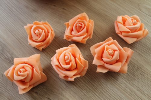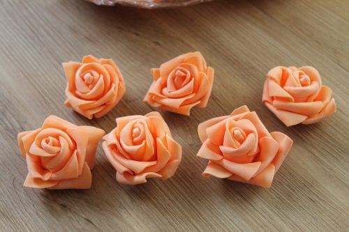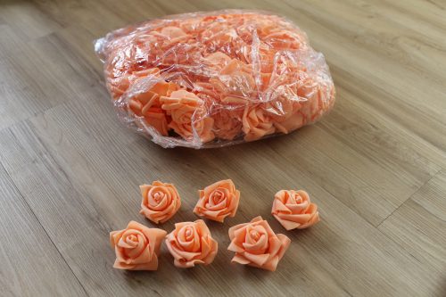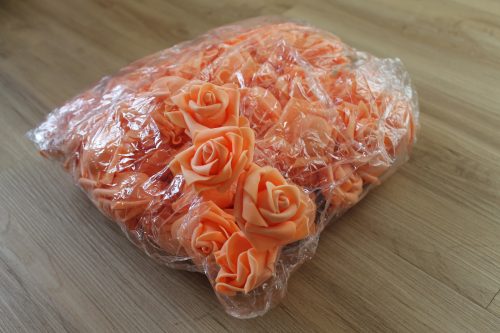 Balení 100 ks pěnových růží v oranžové barvě. Já využiji na svatební dekoraci. Růžičky dorazily v igelitovém pytlu, některé byly pomačkané a mírně deformované. Barva je pěkná, odpovídá fotce u prodejce. Jsou pěkné, kvalitní, hezky drží tvar. Jsou vyrobené z takové pěny něco jako neoprén,ale mnohem jemnější. S výrobkem jsem spokojená a můžu doporučit.