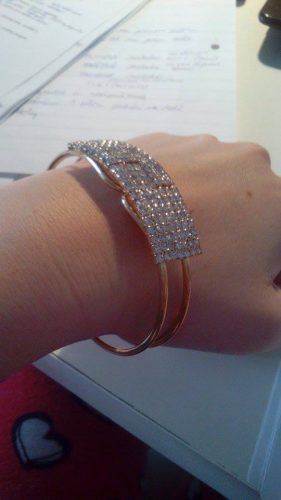 Náramek vhodný především na plesovou sezónu. Rozevírací uprostřed obdélníčku s krystaly. Tvar oválný. Délší strana 6,5cm, užší strana 5cm. Já mám ve zlaté barvě