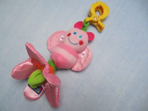Roztomilý motýlek zn. Playgro. V hlavičce má rolničku, květina je připevněna k vibračnímu strojku, takže když se za ni zatáhne, tak se s vibrováním zase vrátí k motýlkovi. Délka natažení 10 cm. Hračka je velmi hezky zpracovaná, dobře a rovně ušitá, detaily jsou vyšité. Na hračce se mi líbí, že má snadné uchycení pomocí klipsu (který je žlutý oproti inzerovanému zboží) prakticky kamkoliv a je dost dlouhá na to, aby na ni miminko dosáhlo např. v autosedačce (vajíčku). Používali jsme ji od narození, kdy miminko na ni jen koukalo a cca ve 2 měs. po ní začalo sahat a ve 4 měs. už za ni umí zatáhnout, aby vibrovala. Je velmi hezká a rozhodně bych ji doporučila pro každé miminko. Celková délka 30 cm, motýlek je vysoký 10 cm a široký 12 cm.