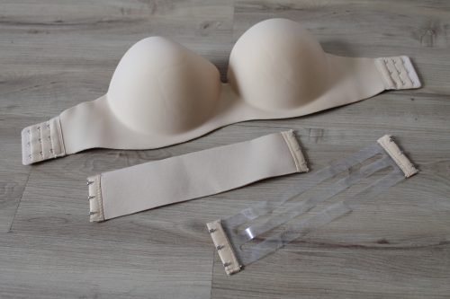 Podprsenka bez ramínek Bezešvá podprsenka mírně vypodložená. Objednala jsem si 36 C a velikost odpovídá. Podprsenka přišla jen v igelitovém sáčku a košíčky byly pomačkané a deformované. Není na klasické zapínání, ale na gumu ve stejné barvě nebo gelové proužky, které jsou také součástí.