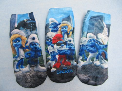 Ponožky s 3D potiskem, nízké, kotníčkové. Jsou bavlněné s příměsí elastanu. Potisk je na vrchní části ponožek, spodní nášlapná strana a kotník zezadu jsou bílé. Po mnoha praních barvy neblednou, ale ponožky žmolkují, hlavně tedy na nášlapné straně. Velikost ponožek nebyla určena, jen délka od špičky po okraj 18 cm a nášlap 16 cm. Naměřila jsem celkovou délku 18 cm, ale nášlapná část je 14,5 cm. Dcera 4,5 roku má nohu vel. 27 a jsou jí ještě dost větší, proto odhaduji na věk 6-8. V balení je 12 párů ponožek - 4 motivy, každé 3x