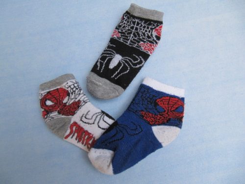 Bavlněné ponožky se vzorem - na kotnících Spiderman, na nártu černý pavouk. Díky pavoukovi se syn ve 2 letech naučil správně oblékat ponožky :-) Po mnoha praních žmolkují, zevnitř mají natažené nitě (vyplétaný vzor). Velikost byla uvedena univerzální pro 2-7 let, ale je to pro 2-3 roky. Celková délka je 15 cm, nášlapná 9 cm. V balení bylo 12 párů ve 3 barvách - viz foto.