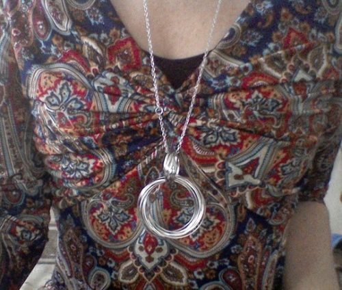 S labutí mi stejný prodejce poslal ještě i zajímavý náhrdelník s kroužky. Je zajímavý a odpovídá nabídce, jen je trochu těžší, ale pro krásu se holt musí trpět. Má kvalitní uzávěr, jež dobře funguje, ale stejně je rychlejší si jej prostě natáhnout přes hlavu uzavřený.Je dost dlouhý. Rozměry: celková délka přívěsku i s řetízkem dohromady - 42 cm vrstvy kroužků - 5 a 5 cm na šířku i délku Z mé strany určitě spokojenost, přišel mi domů za 16 dnů.