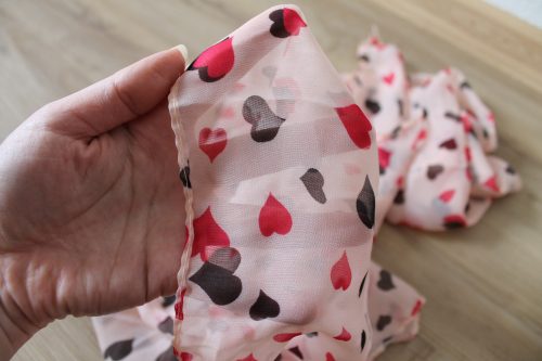 srdíčkový šifonový šátek.. Barva šátku je pastelkově růžová s černými a tmavě růžovými srdíčky. Šátek je průhledný, lehký - spíše na léto nebo jako módní doplněk - moc nezahřeje. Je obšitý, takže se nebude párat. Je široký 40 cm a dlouhý 160 cm. Šátek přišel zabalený v igelitovém sáčku a dále v igelitové obálce.