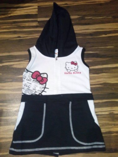 šaty jsou krásné :) materiál slabší teplákovina, na předním díle zip, a 2 kapsičky. další kapsička je na zadečku. Na zadním díle rozpareček. Obrázek Kitty je na předním i zadním díle Dá se nosit i např ja jaře na tričko délka 45 cm pas 30 cm Objednaná velikost 4T na holčičku 2 roky