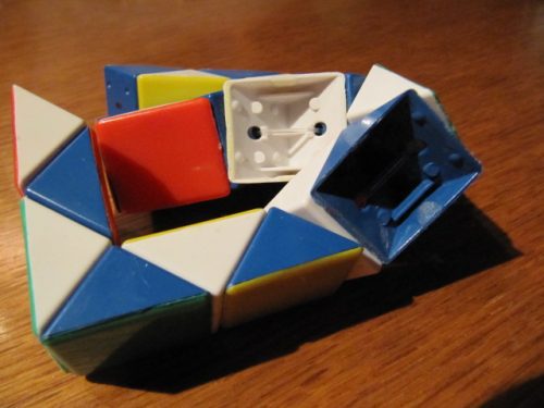 Známá retro hračka, s kterou jsem si ráda jako malá hrála, proto jsem ji koupila i svým dětem. Tato je mnohem menší než dřívější hnědo-béžová varianta. Ale pro dětské ručky je tak akorát. Při skládání je docela odolná, vydrží i trochu hrubější zacházení od dětí než pochopí princip protáčení trojúhelníčků. Jediné co moc nevydrželo, jsou horní barevné plošky. Vyskočí i při opatrném zacházení, po 2 měsících občasného používání nám již vyskočily 3 kusy. Zkusila jsem přilepit vteřinovým lepidlem, ale při protáčení přečnívají přes hranu a proto znovu vyskočí tlakem přilehlého trojúhelníku. Přesto bych hračku doporučila, lze sehnat již za cenu něco málo přes dolar a děti opravdu zabaví a zároveň jim procvičuje představivost. Tato varianta je z 24 dílků (tj. 12 barevných plošek zespodu hada a 12 zvrchu hada), z které lze vytvořit koule. Na AliExpress se dají sehnat i náročnější varianty - 36, 48, 72 a 120 dílků. Ze 120 se dá vytvořit pětikoule! Kromě tohoto hranatého hada je i had kulatý, který je místo trojúhelníčků tvořený z trubek. Najít se dá pod názvem Twist snake nebo Magic snake. Velikost 24 dílků - délka hada 35 cm, šířka 2 cm, výška 1,2 cm. Vytvořená koule má průměr 5,5 cm.