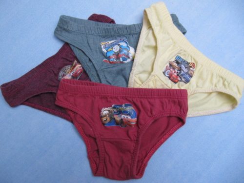 Krásné bavlněné slipy pro chlapečky. Potisk je pogumovaný, po cca 2-3 praních popraskal a olupuje se. Objednána vel. 2 roky, na cedulce uvedena vel. 3-4, skutečně odpovídají 2-4 rokům. Šířka přes boky 2x 21 cm, pas v klidu 2x 20 cm, roztáhnutý max. 2x 28 cm, výška 15 cm. V balení 12 ks, různé barvy i motivy - Cars, Angry Birds, Mašinka Tomáš