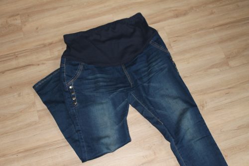Těhotenské rifle s elastickým vyvýšeným pasem. V pase je gumka na knoflík a lze utáhnout. Rifle jsou pěkně ušité a z kvalitního materiálu, jsou pevnější, ale elastické. Dobře se nosí jsem s nimi spokojená.