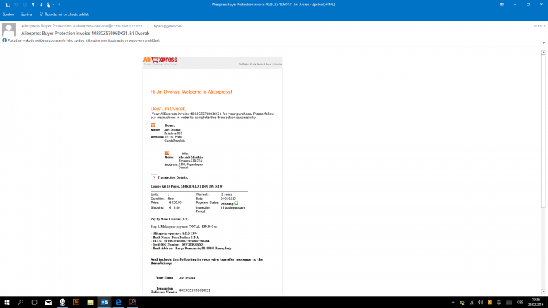 Mám dotaz. Našel jsem inzerát na prodej nářadí (na Bazoš.cz). Nakonec jsem zjistil, že prodávající je cizinec, prý se odstěhoval zpět do Dánska a nabízené zboží (v hodnotě cca 15000,-Kč) navrhuje zaplatit přes AliExpress. Prý to zajistí. Peníze prý půjdou na účet AliExpressu a když potvrdím, že zásilka v pořádku došla, přepošlou peníze odesílatelovi. Ano, tak by to mělo fungovat, ale…. Záhy mě od AliExpressu přišla emailem výzva k platbě. Email mě přišel trochu podezřelý, protože má starší logo, a neaktivní odkazy na web. Také jsem očekával, že tam bude proklik do platební brány AliPay – nikoliv bankovní spojení do Itálie. Proto mám obavy, abych peníze neposlal jen tak někomu na konto (někdo, kdo se vydává za AliExpress) a pak už bych mohl jenom tlouct hlavou do stolu…;-) Email přikládám v příloze. Máte někdo zkušenost? Případně je možné někde ověřit správné číslo účtu na AliExpress? Moc děkuji za reakce přímo na email: [email protected]