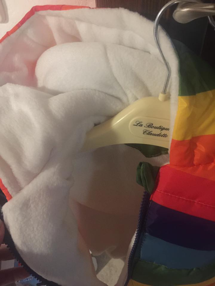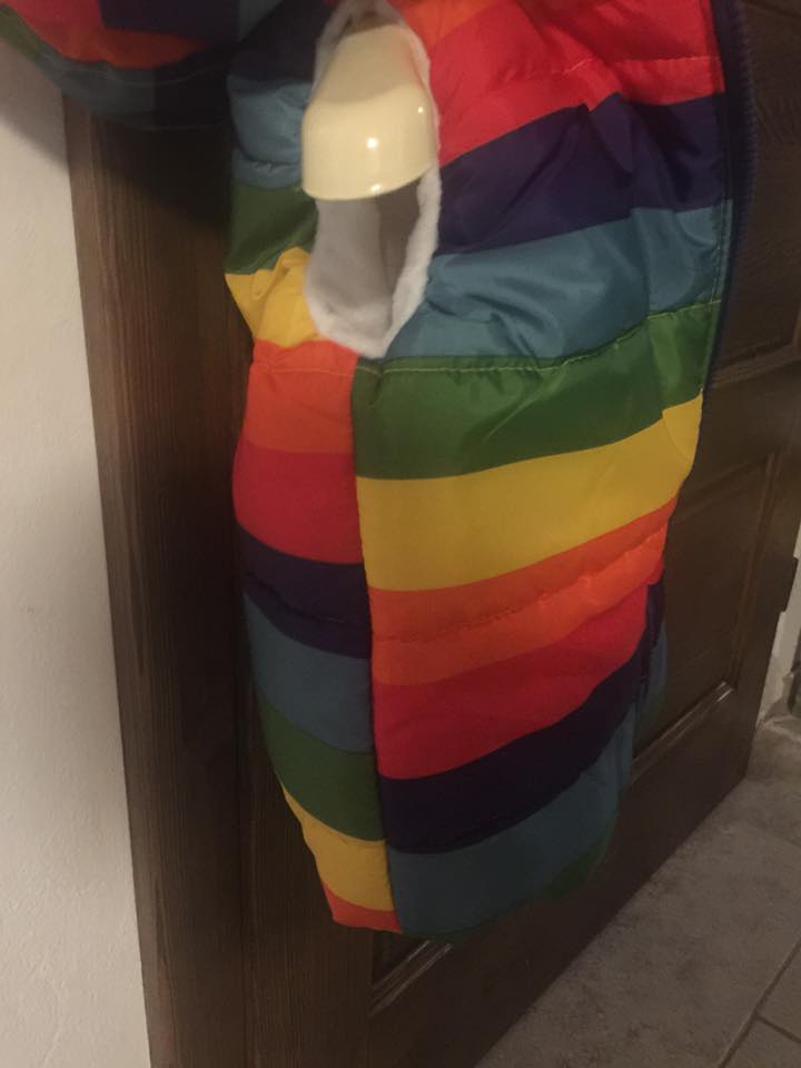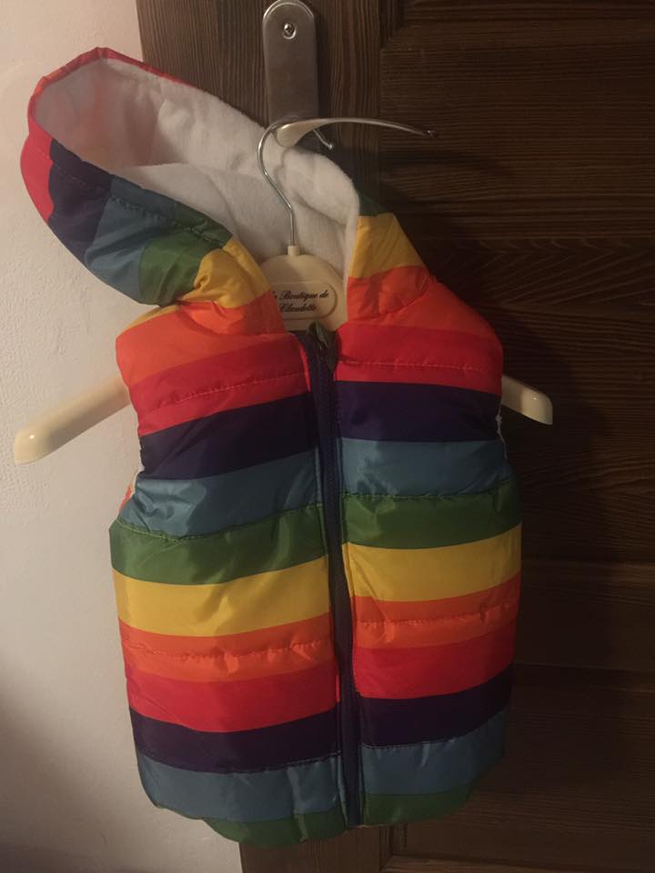 Detska vesta. Zadna vysoka krejcovina, s navaznosti barevnych pruhu si hlavu…