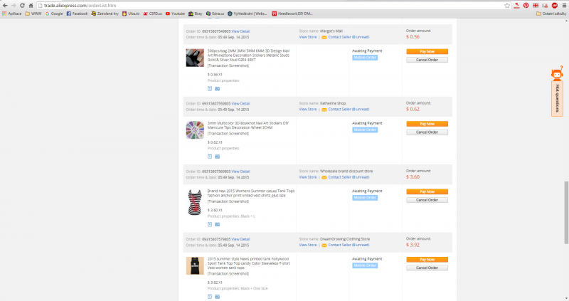 v pondělí 14. září jsem si objednala nějaké zboží od více prodejců asi cca za 67 dolarů. Platila jsem přes mobilní telefon, protože tam na některé věci byla sleva. Při platbě mi to hodilo chybu, tak jsem zkusila platbu podruhé – už v pořádku prošla. V mém internetovém bankovnictví je částka za zboží ztržená. Problém nastal až dneska, kdy mi jeden prodejce psal ať zaplatím za zboží, aby mi ho mohl co nejdříve poslat. Našla jsem si teda na svém emailu zprávu, kterou mi poslal Ali, že platba je přijata a poslala jsem ho prodejci. Avšak mi to nedalo a koukala jsem se do “My orders”, kde jsem zjistila, že mám duplicitní objednávku se stejným časem a datumem objednání s tím rozdílem, že jedna je zaplacená a druhá čeká na mojí platbu. Mohli by jste mi poradit co s tím? Zda mám dát “Cancel order” nebo napsat někam na Ali? Mockrát děkuji za odpověď, Kristýna.