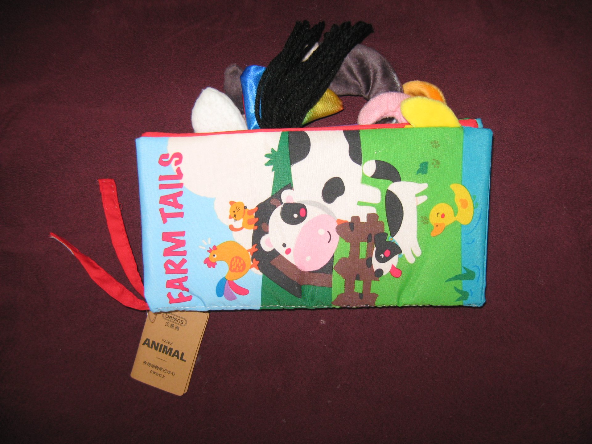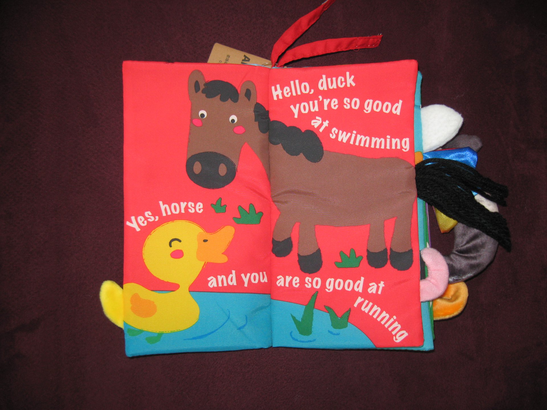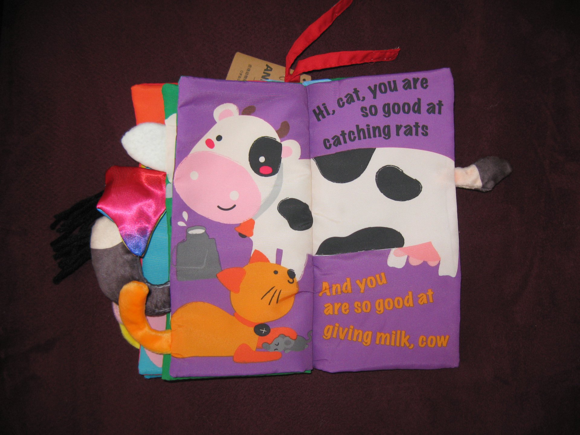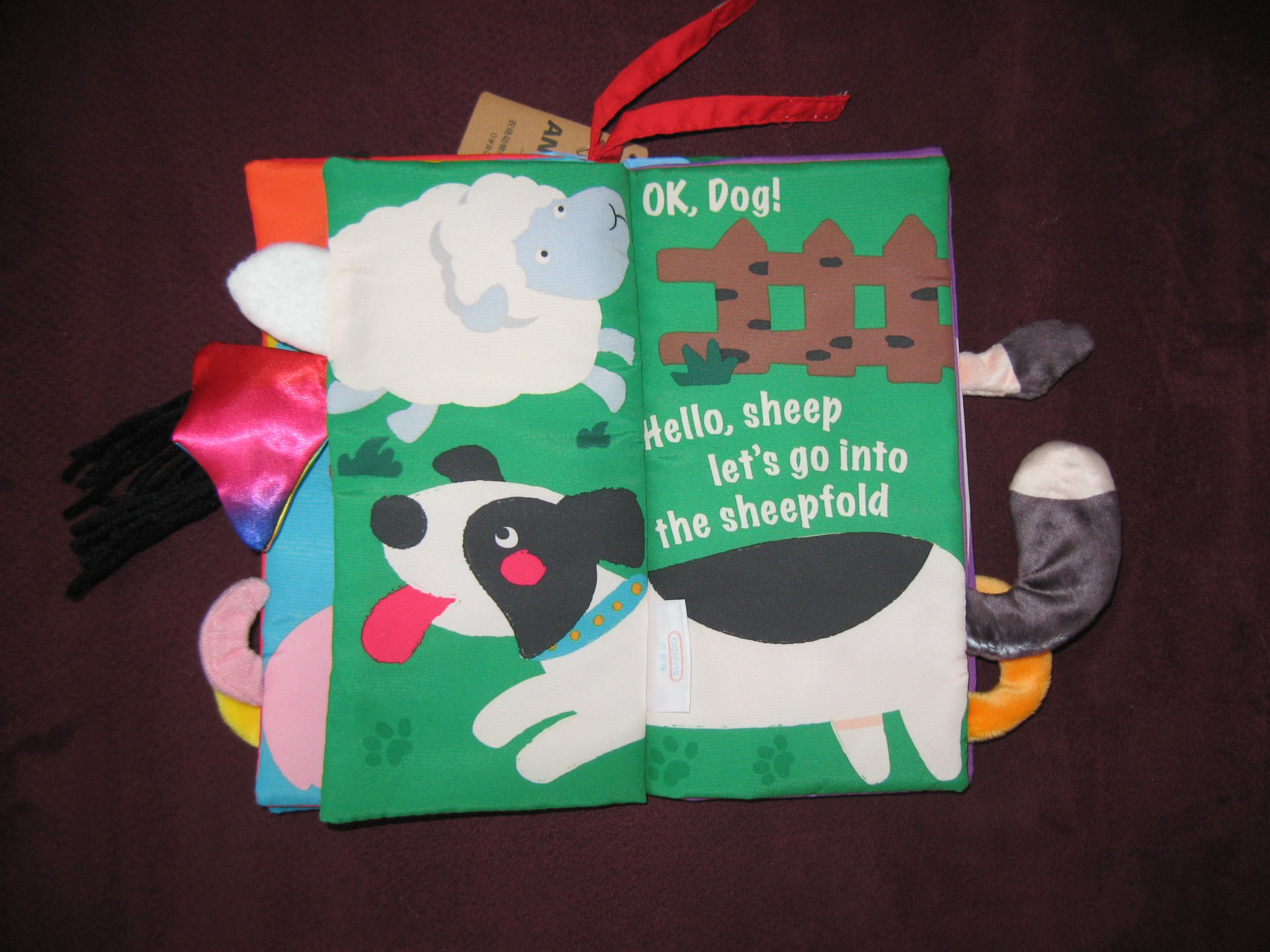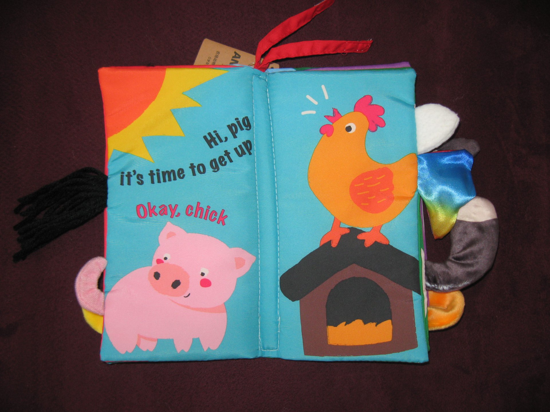 Krásná látková knížka pro prcky. Přední a zadní strana šustí, kohoutovi píská…