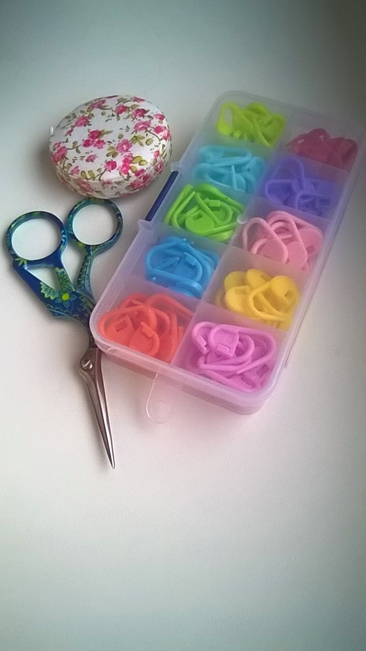 Neco na pleteni. Metr i nuzky jsou oka. Ty barevne vecicky-znackovace je lepsi…