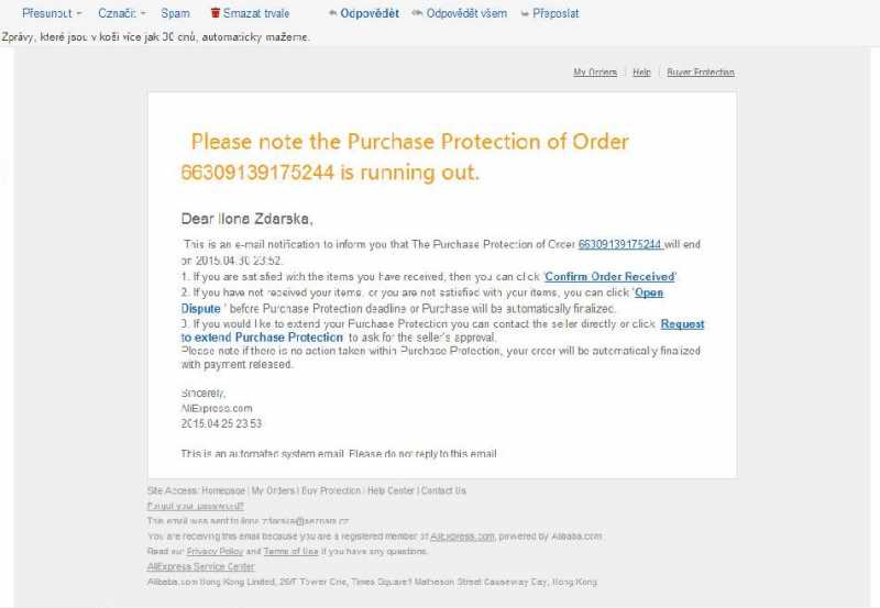 Zásilka HQ nebo 1 a koncici BJ – [url=http://track.yw56.com.cn/en-US/]ZDE[/url])Kdyby ty 4 dny došly, tak Vám skončí ochranná lhůta, jenže mám dojem, že i když jste tedy o prodloužení zažádala, prodejce Vám tu žádost neschválil. Je lepší si žádat dříve, abyste měla pro příště čas to nějak řešit. Pokud Vám prodejce příště zhruba tak 10 dní před koncem ochranné lhůty Vaši žádost neschválí, tak neváhejte a zkontaktujte Aliexpress podporu [url=http://www.aliexpress.com/help/newContactUs.htm?autoreply=buyerservice]ZDE[/url]. A myslím si, že by stálo za to to zkusit i teď. Rozkliknete si odkaz, vyberete si tam do jaké sorty patří Váš problém – takže třeba Shipping a podrobně jim popište, co se Vám stalo, měl by to být chat s živým člověkem! Může to znít třeba takto: “Hello, I’ve got problems with my order number (doplníte číslo objednávky). My order is curently finished but I haven’t received my goods yet and I think I will never receive it. I tried to extend purchase protection 4 days before it should have ended but the seller didn’t accept it and now my time is out. I tried to track my order but I can’t find it. That means I’m without my goods and without my money. What can I do, please? How I can I solve this problem? Thank you.”